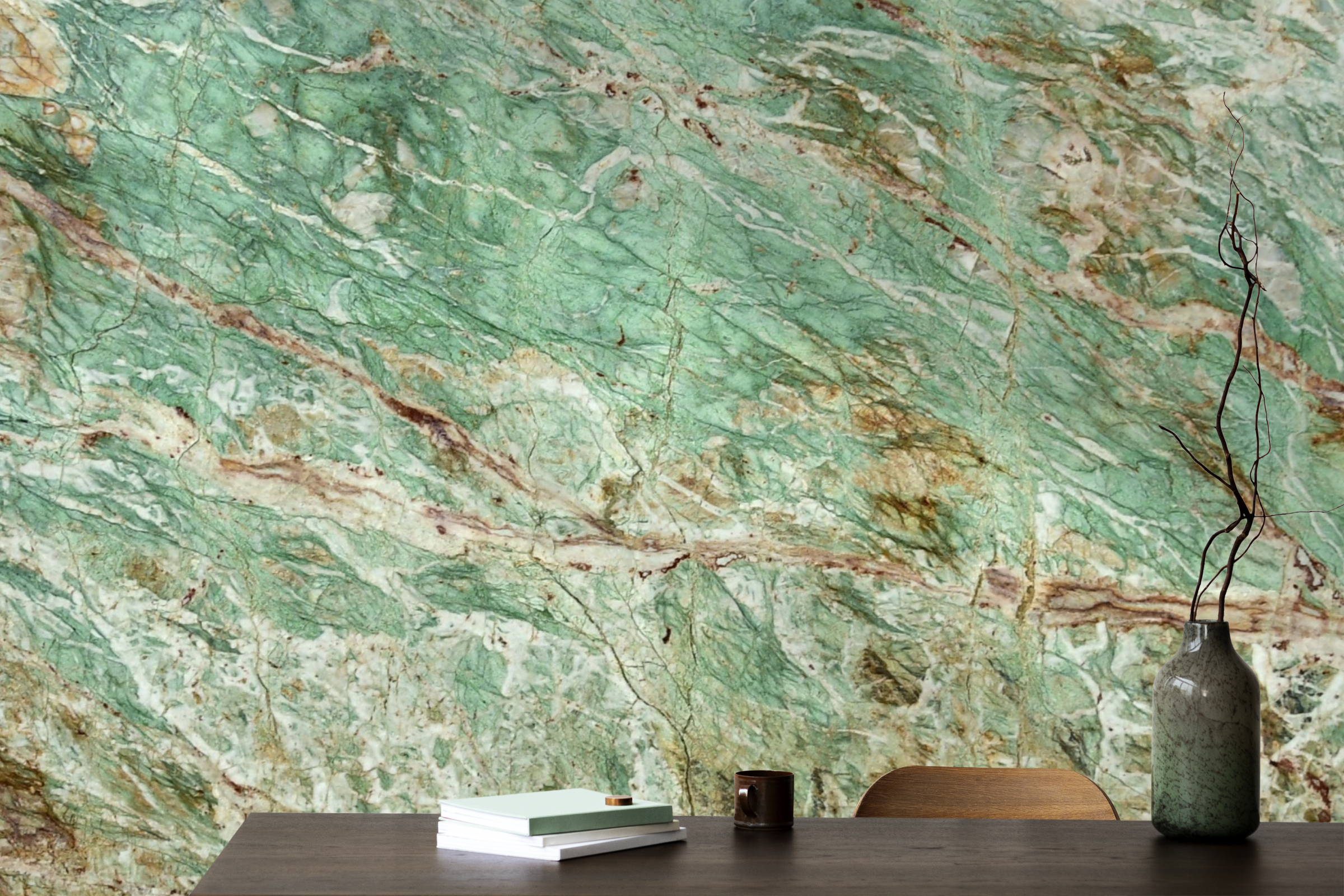 Amazon Green complements a wide range of materials, pairing beautifully with dark or warm wood tones, matte black hardware, brushed brass accents, and crisp white or deep charcoal cabinetry. It enhances modern spaces, enriches organic designs, and brings character to interiors that call for a bold statement. From dramatic kitchen islands to luxurious bathroom installations, this stone commands attention.