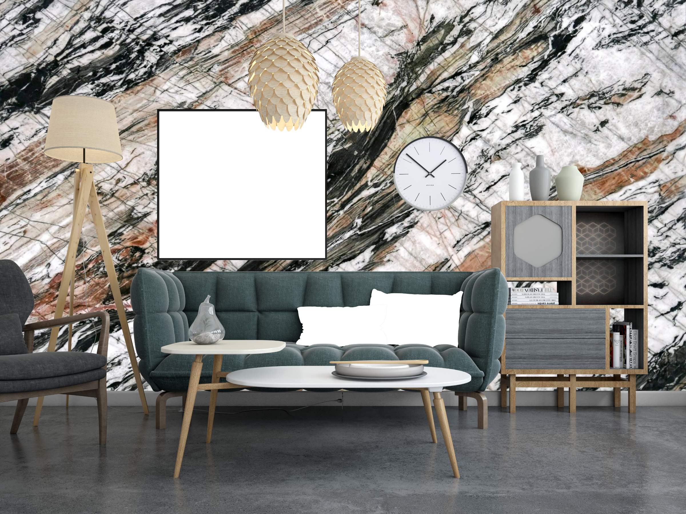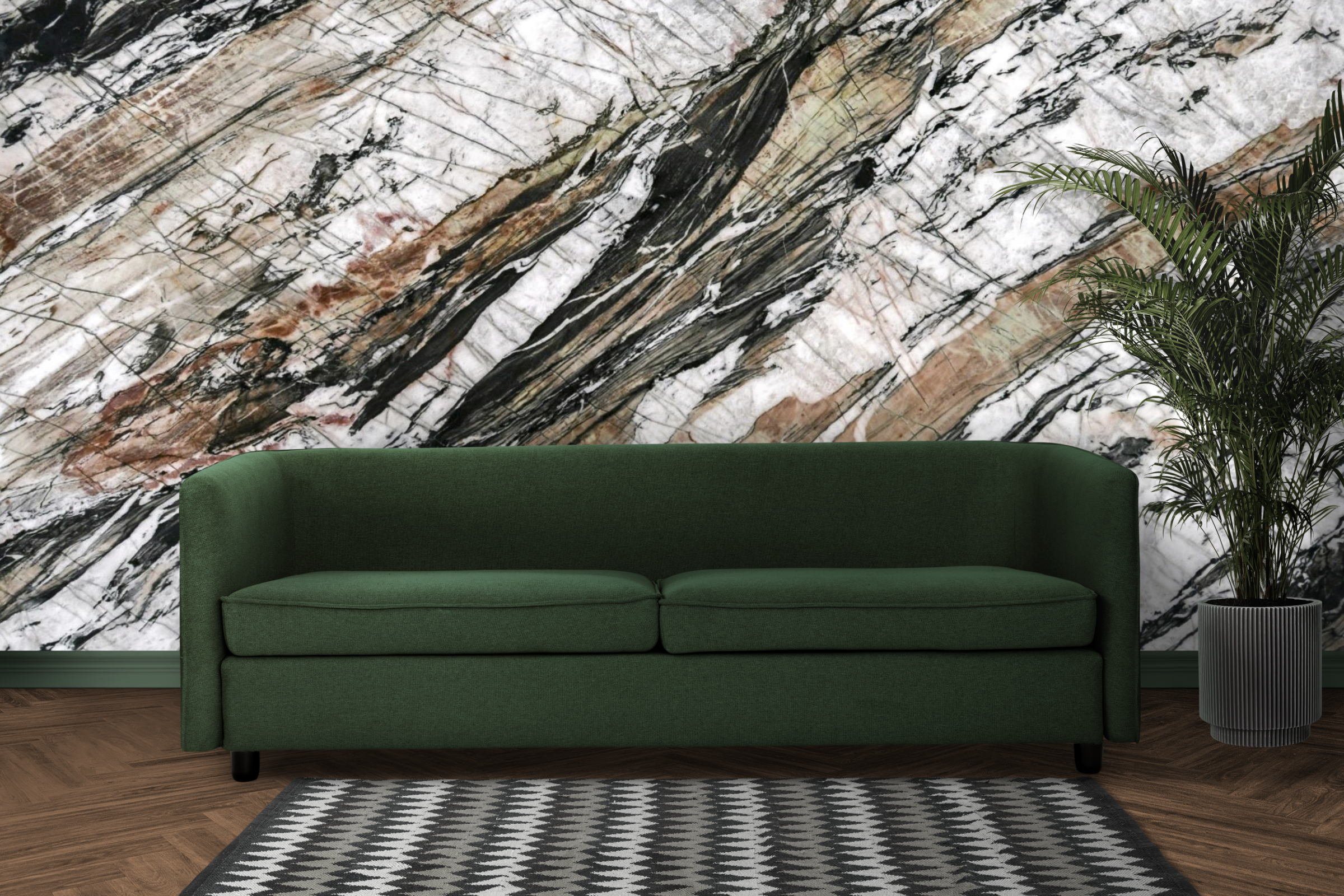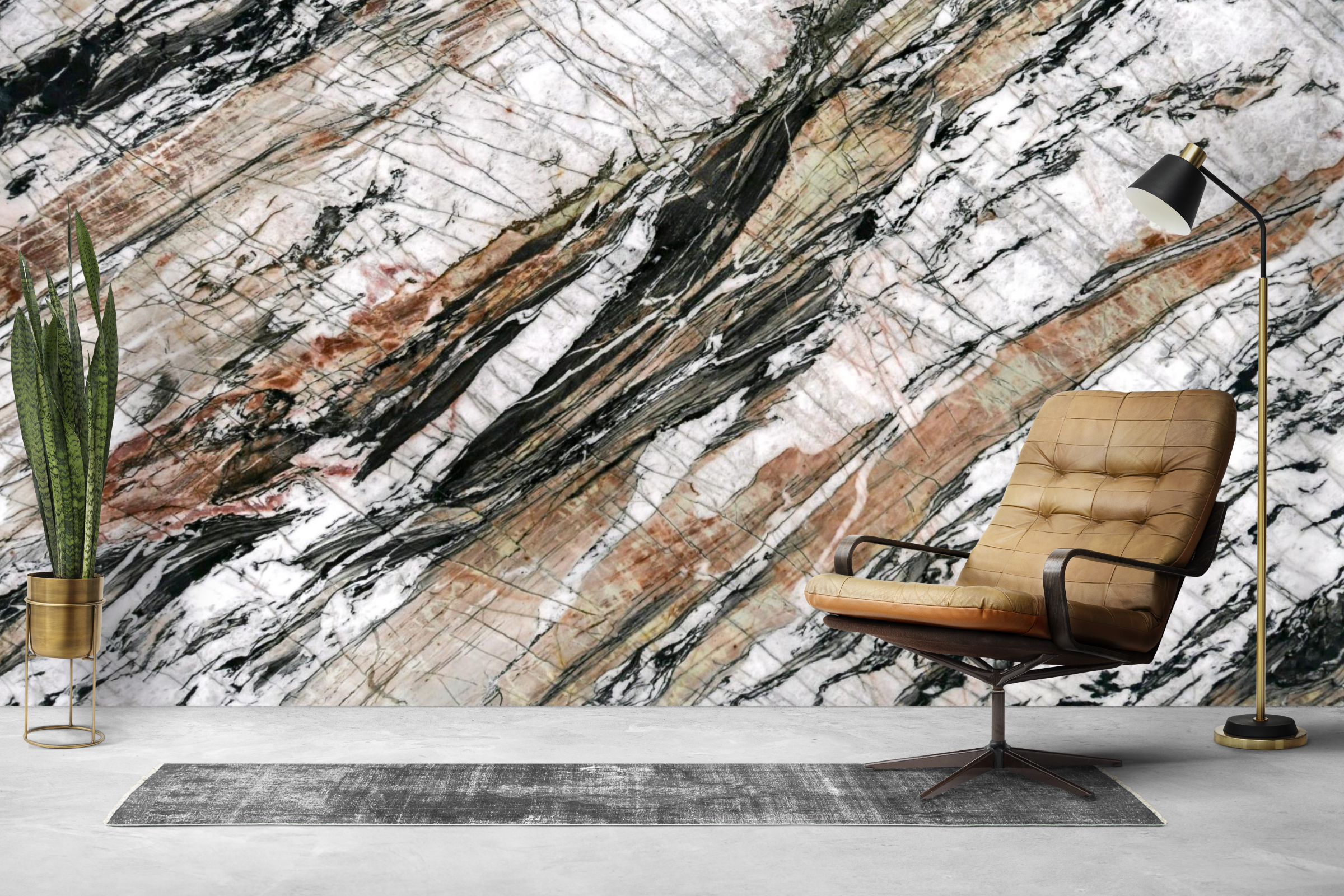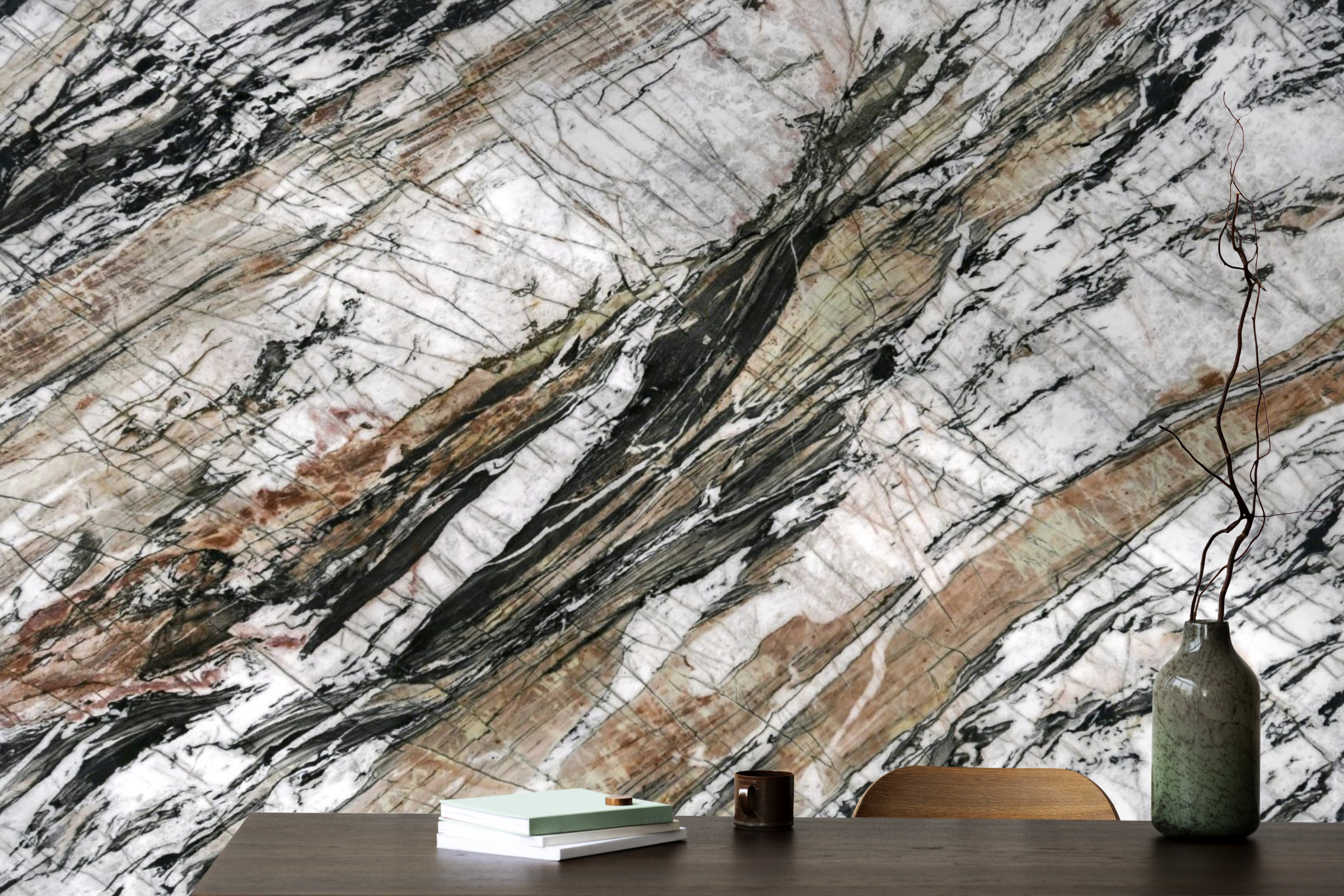 Bold dark lines travel organically across the slab, adding definition and visual strength. Layers of grey soften the movement and introduce dimension, while touches of warm brown bring natural warmth and harmony to the overall composition. Together, these elements create a dynamic yet cohesive pattern that captures attention without overpowering the room.