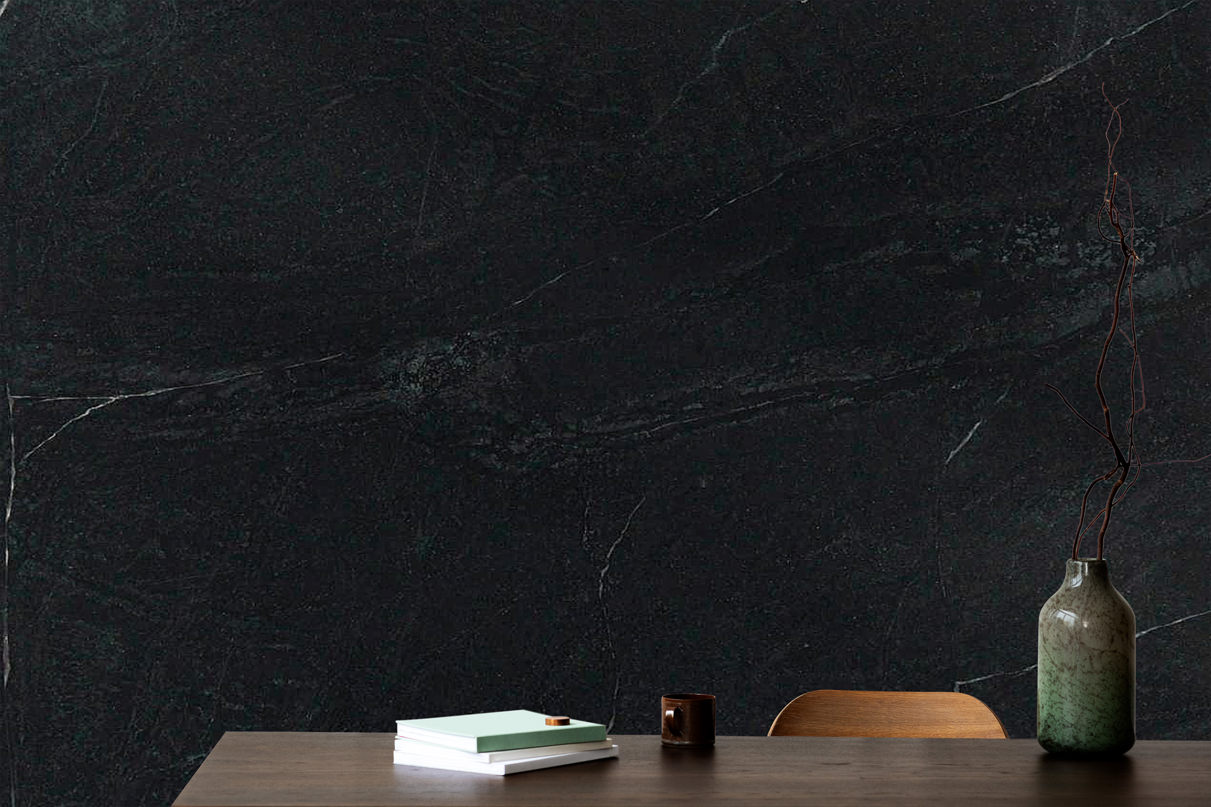 Delicate markings move subtly through the slab in tones of pale green, soft charcoal, and occasional light accents. These gentle variations add dimension while preserving the stone’s calm, cohesive appearance. When treated with oil, the green becomes more saturated and lustrous, bringing added contrast and highlighting the stone’s natural depth.