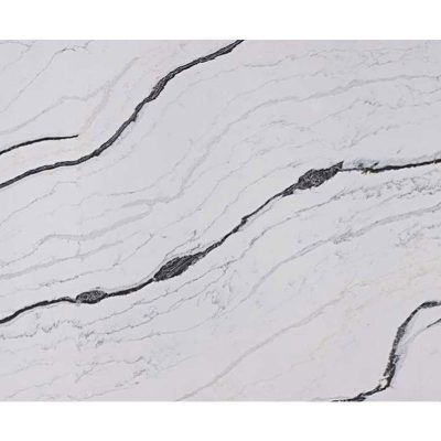 What distinguishes this quartz is its striking black veins that traverse the surface in intricate and dynamic patterns. These veins vary in thickness and intensity, ranging from fine lines to bold strokes, creating a captivating visual contrast reminiscent of natural marble. The interplay between the white background and black veins enhances the stone’s depth and character, making it a focal point that commands attention in any room.
