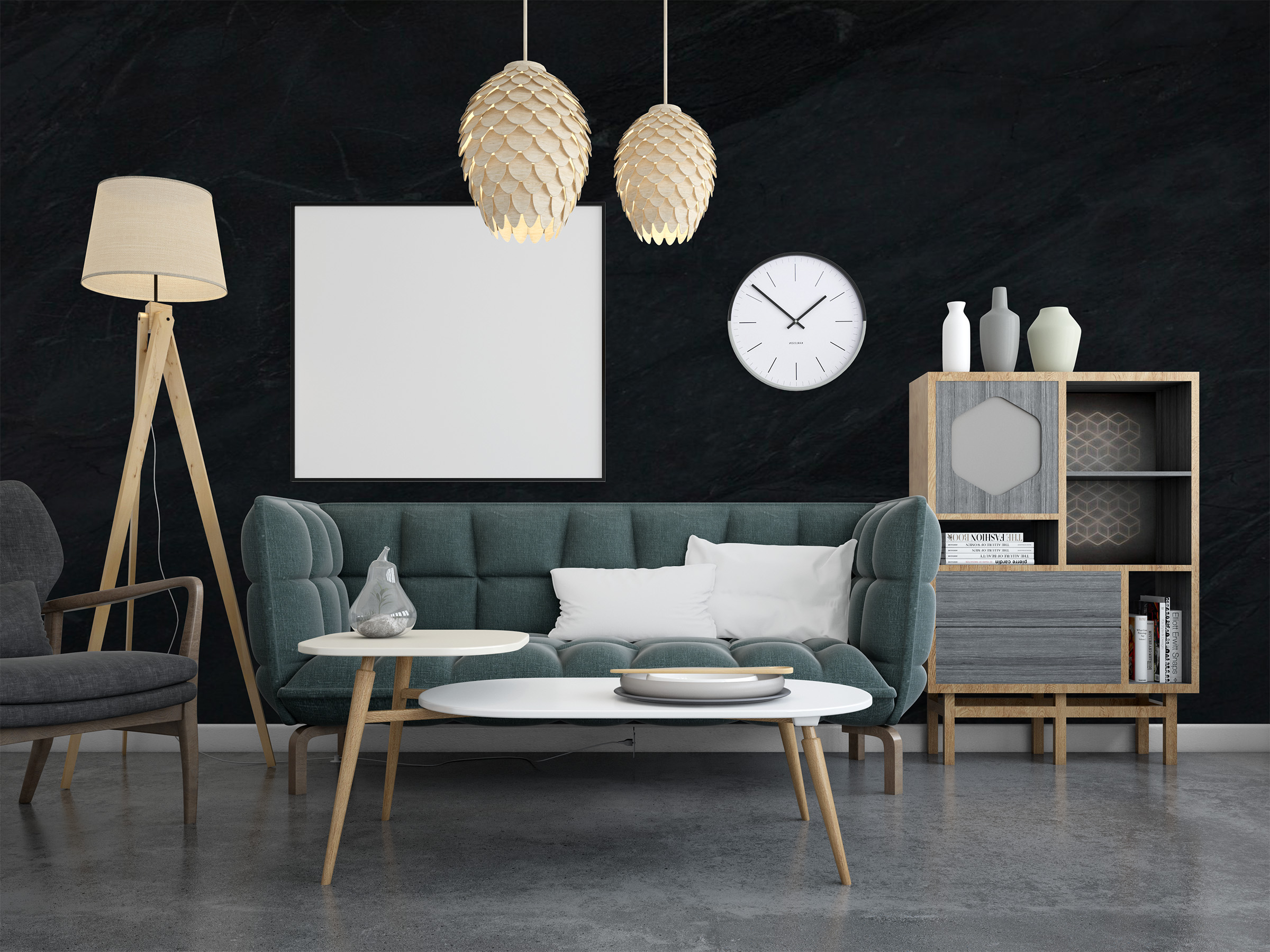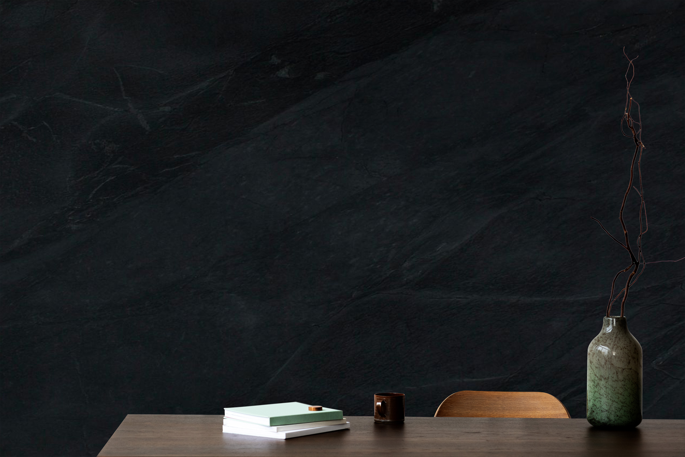 Gentle waves of darker black and muted charcoal drift across the slab, creating a layered, tonal appearance. These understated variations introduce texture and natural interest while preserving a cohesive, uniform look. When oiled, the stone deepens in color, revealing richer contrast and enhancing its moody, dramatic presence.