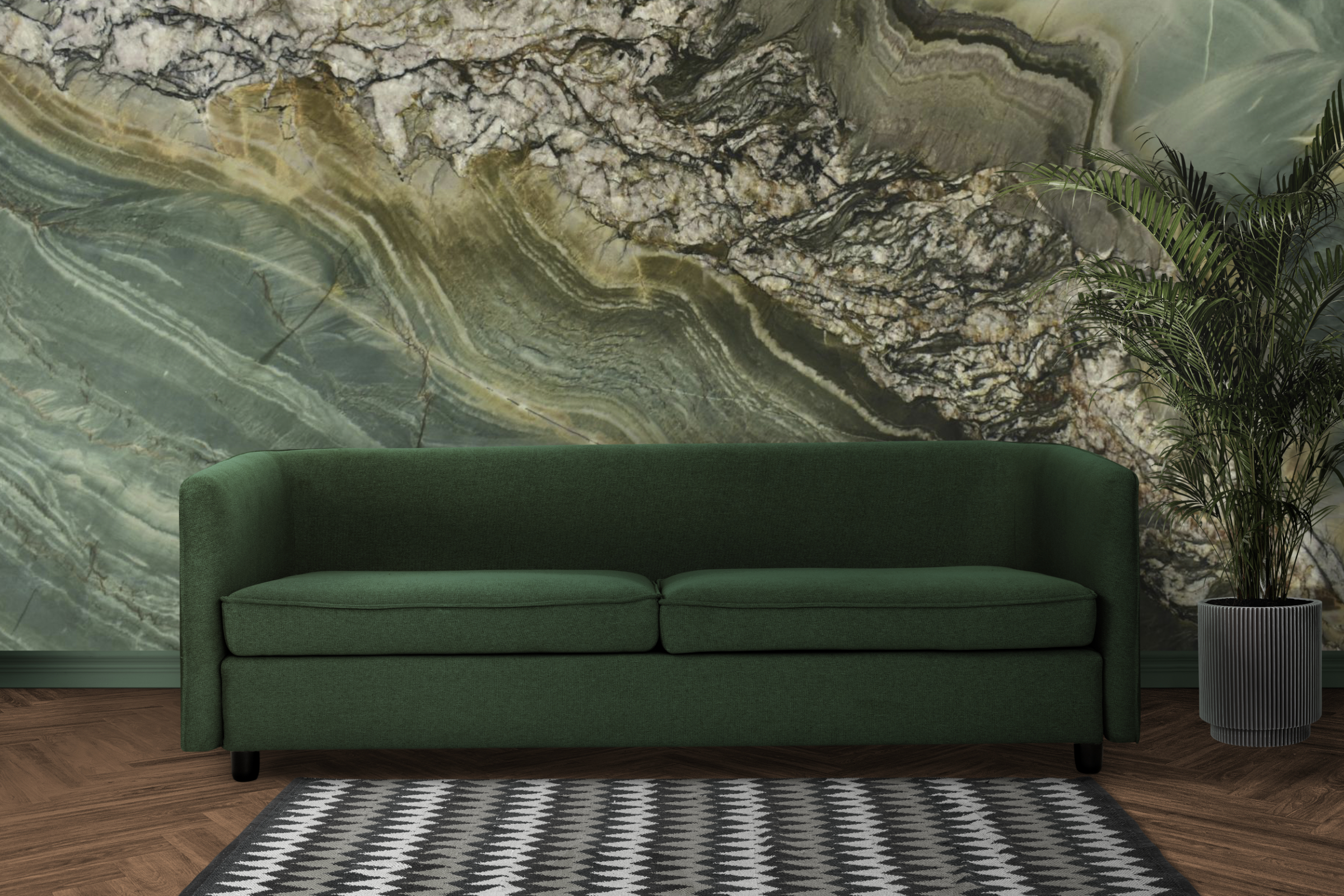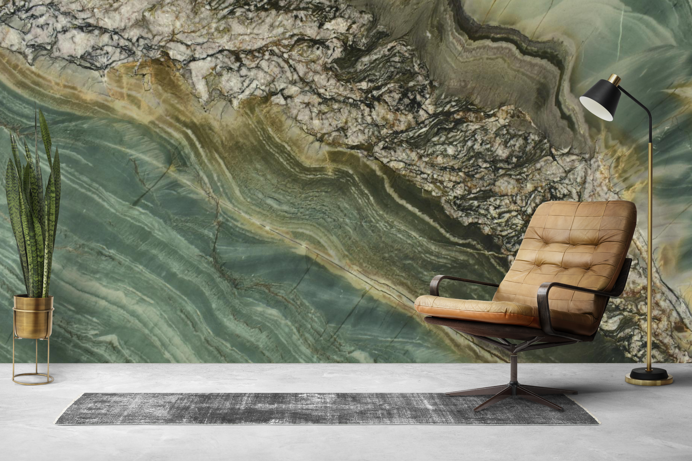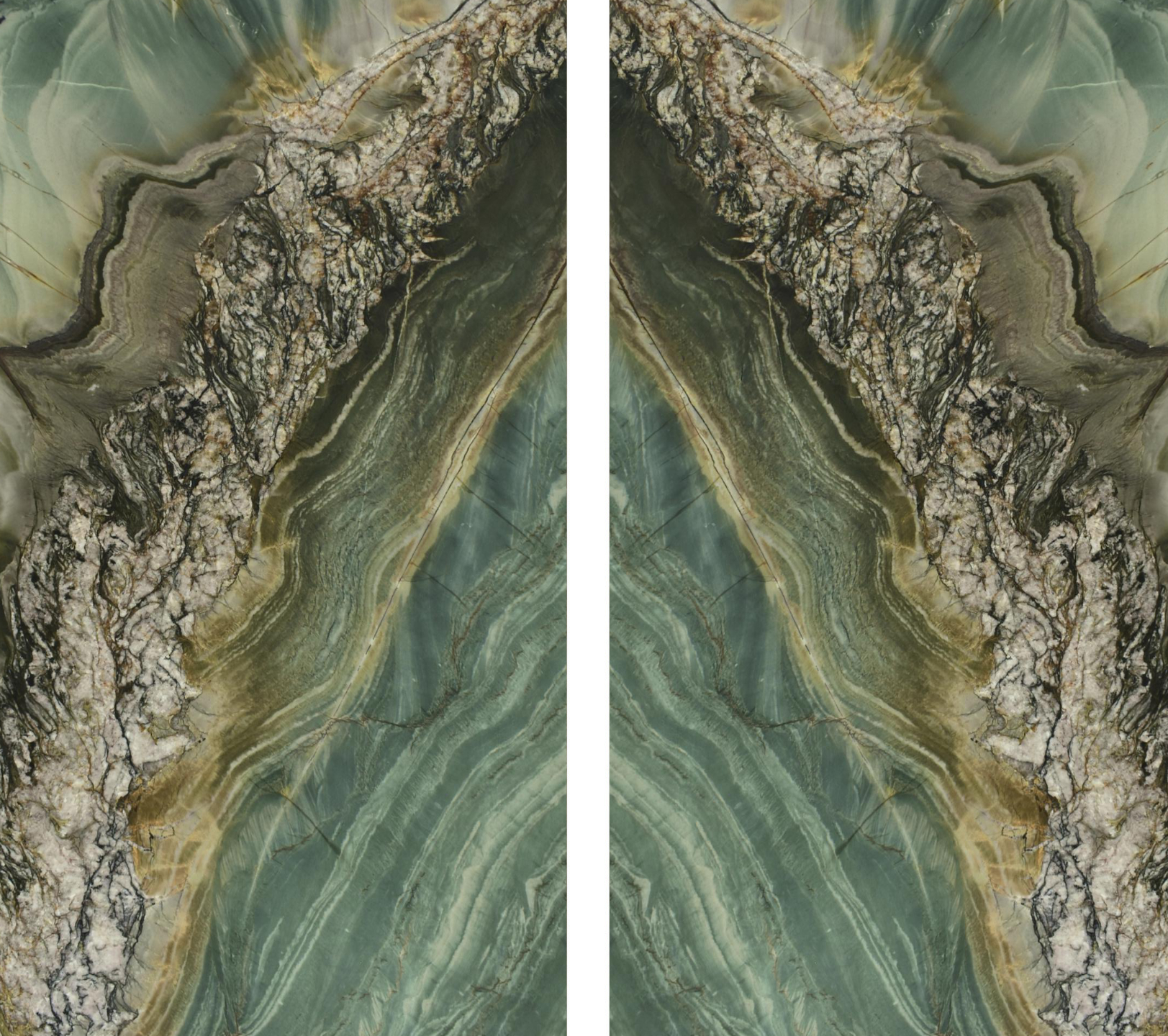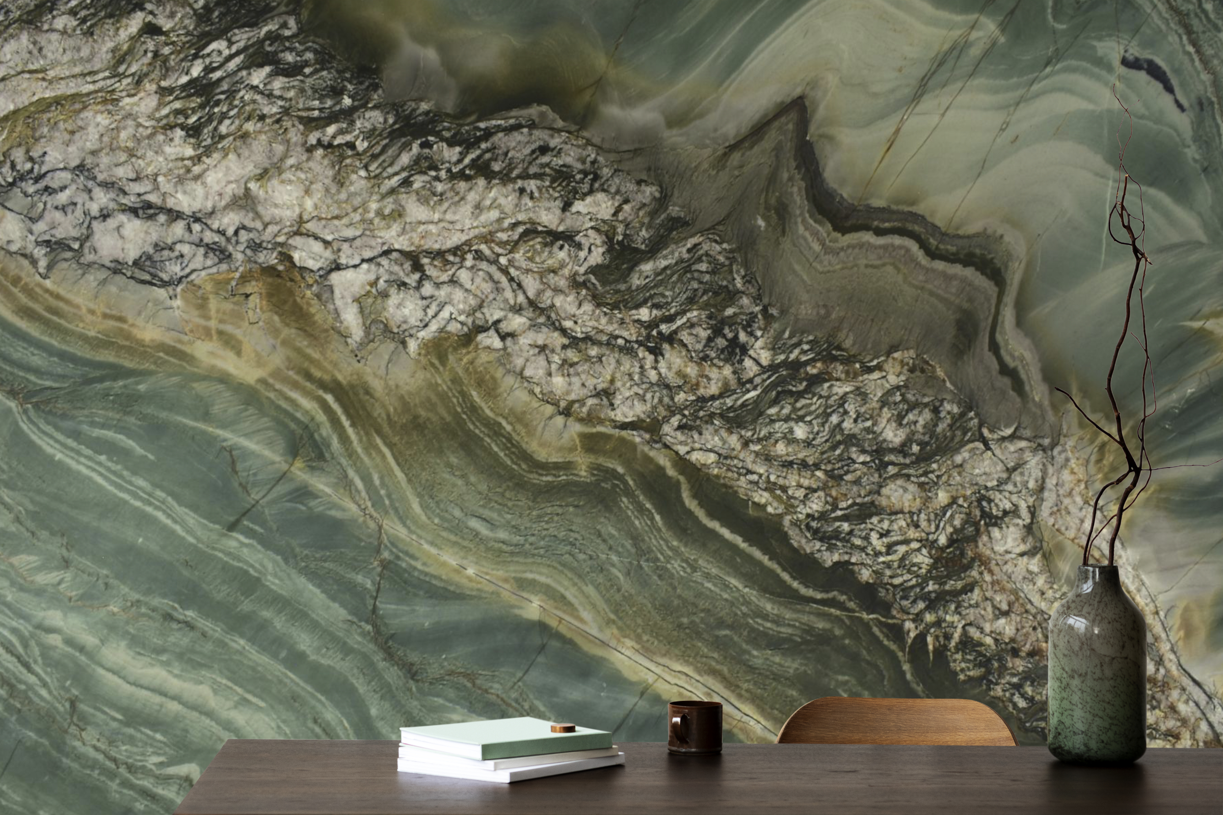 Stella Rossa showcases a deep green surface layered with an expressive blend of black, grey, white, and brown veining, creating a look that is both dramatic and refined. The stone makes an immediate statement, establishing a sense of luxury and depth that anchors any interior. Its rich green base provides a striking canvas for the stone’s complex natural patterns.